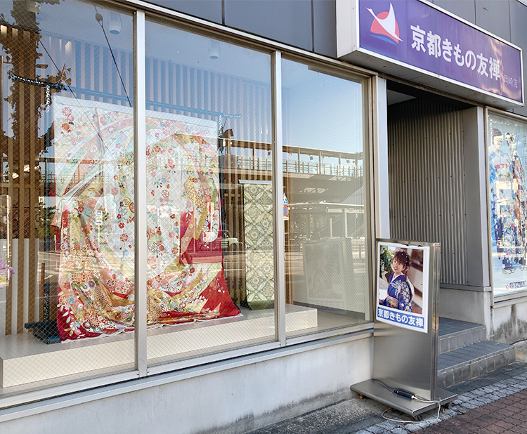 京都きもの友禅 岡崎店は、名鉄東岡崎駅からもほど近い、市の中心エリアに店舗を構えています。